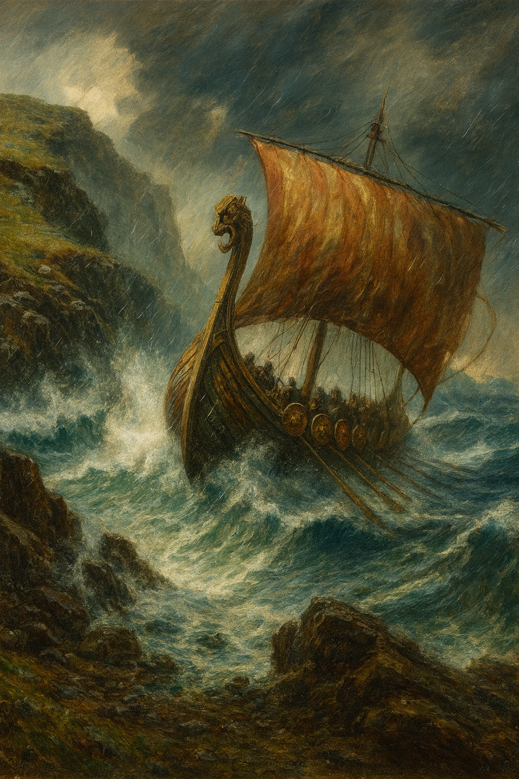 They spotted a Viking longboat drifting in the bay, its mast broken and its crew near death.