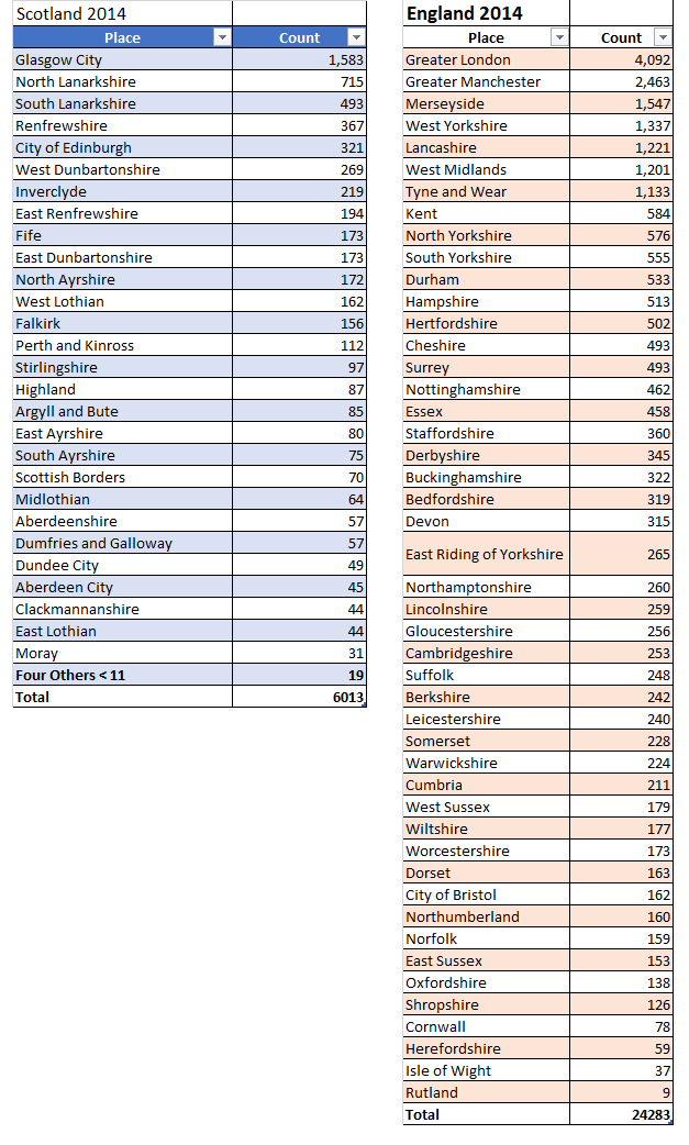England vs Scotland Gallagher Population Comparison Tables (2014).