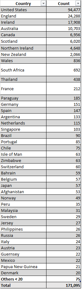 Note: There are an additional 87 countries worldwide with one or more people named Gallagher, but fewer than 20 individuals per country.